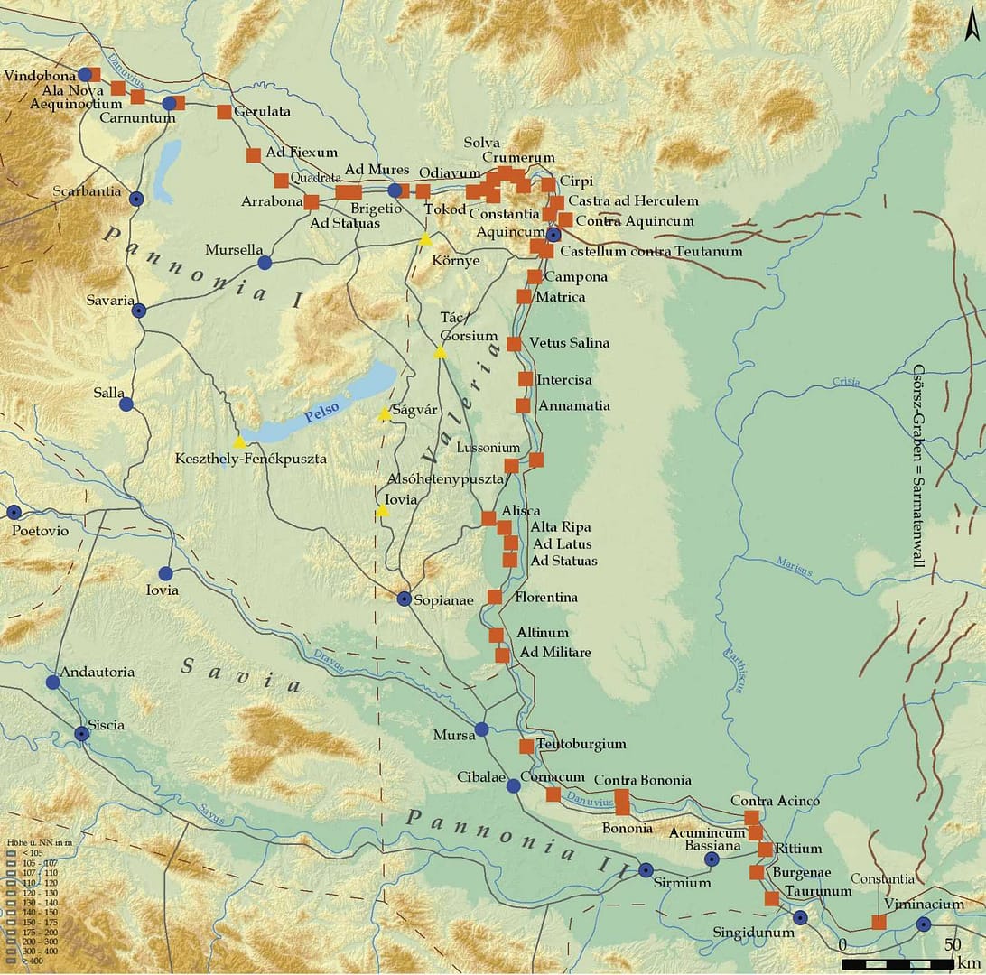 The Roman province of Pannonia, established in the 1st century AD, stretched across present-day western Hungary to the Danube in the east, the Sava in the south, and the Eastern Alps in the west.