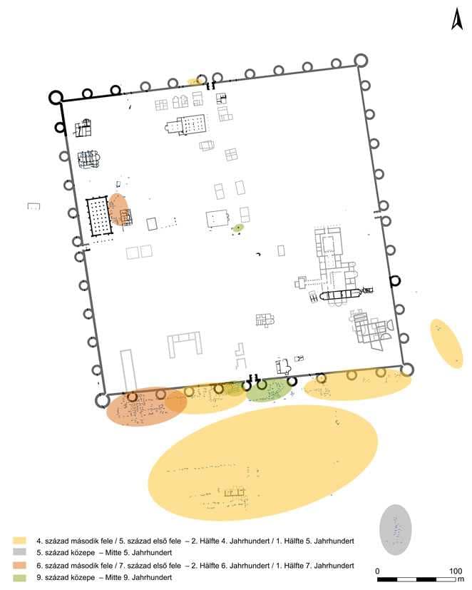 The population of the fortification usually had interments outside the walls, however since the end of the 19th century cemeteries and cemetery sections have emerged further from the fortification. Thus far three periods have yielded interments: the Late Roman period (4th-5th centuries), the early Middle Ages (Keszthely culture: 6th-7th centuries), and the Karoling Age (9th century). There arises the fundamental question: whether continuity could exist relating to the different burial groups, that is, there might be subsistence beyond the middle of the 5th century, or else, migrants could start a new life within the fortification after 568 – the fall of the Avars. Optionally, the population that had existed here was filled up with new migrants.